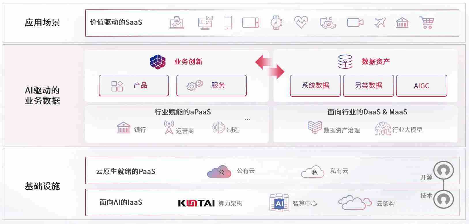 数字时代,,,,围绕企业数字化转型的关键要素,,,,AG尊龙凯时数码开创性的提出数云融合战略和技术体系框架,,,着力在云原生、、、数字原生、、、AI原生和信创产业上架构产品和服务能力,,,,为处在不同数字化转型阶段的快消零售、、、、汽车、、、金融、、、医疗、、、、政企、、教育、、、运营商等行业客户提供泛在的敏捷IT能力和融合的数据驱动能力,,,构建跨界融合创新的数字业务场景和新业务模式,,,助力企业级客户建立面向未来的核心能力和竞争优势,,,全面推动社会的数字化、、、、智能化转型升级。。
