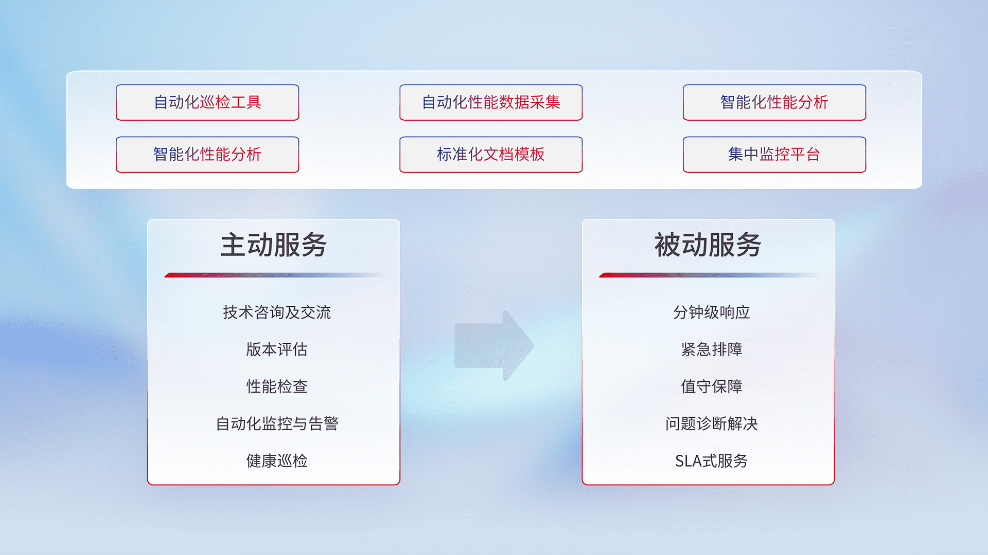 智能化工具和标准化文档,,保障服务质量,,提供主动服务(包含技术咨询、、、版本评估、、、、性能检查、、、自动化监控与告警、、、、健康巡检)和被动服务包含(分钟级响应、、、、紧急排障、、、、值守保障、、问题诊断解决、、SLA服务)。。。